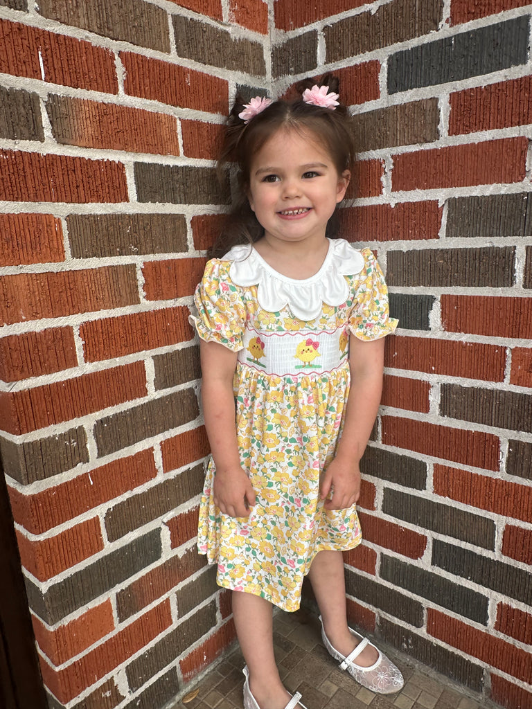 Celebrate spring in style with this charming Easter Yellow Chick Embroidery Floral Girl Dress. Featuring delicate chick embroidery paired with cheerful floral accents, this dress captures the joy of the season in a design little ones will love. The soft yellow hue creates a fresh, festive look perfect for Easter celebrations, family photos, or springtime gatherings. Comfortable and playful, it's an ideal choice for making memories in style.