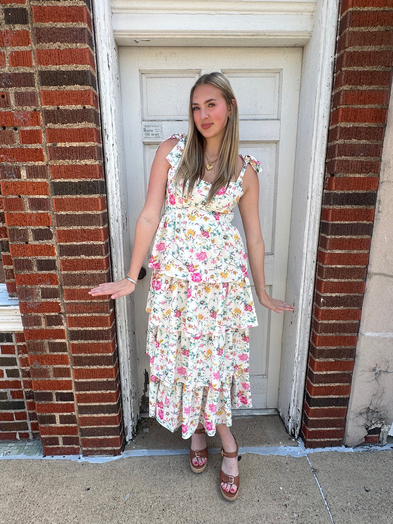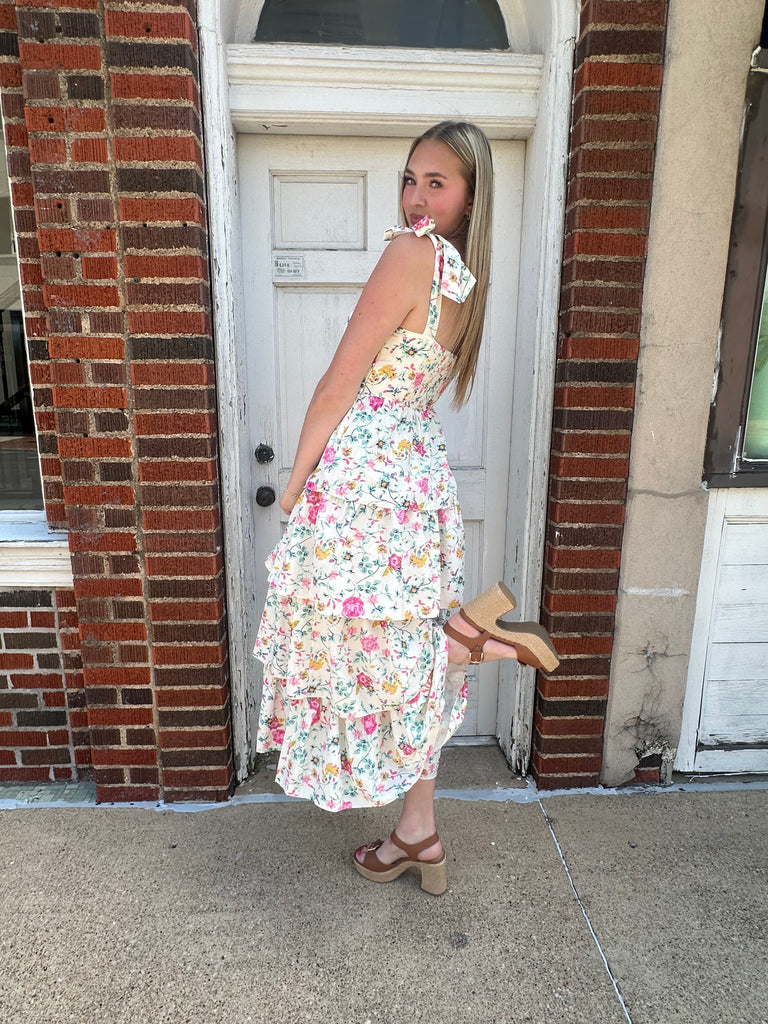 Feminine, flirty, and made to turn heads šø The Poppy Petals Maxi Dress features a soft floral print with cascading tiered layers that create the most beautiful movement with every step. Designed with a flattering fitted bodice and adjustable tie straps, this dress gives you the perfect mix of comfort and shape.