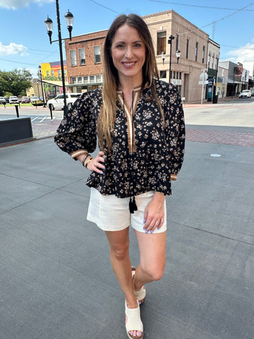 Solid airflow peplum blouse with puffed embroidered 3/4 sleeve.