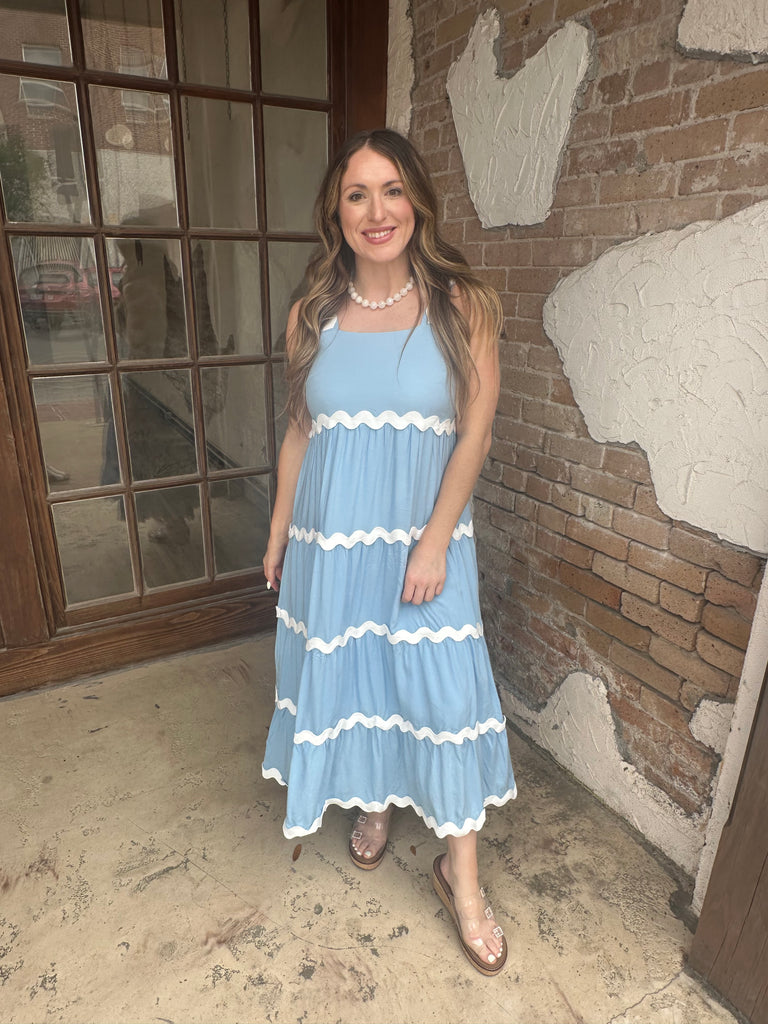 This flowy blue dress features delicate white trim detailing that adds just the right amount of contrast and charm. Designed with a relaxed, tiered silhouette, it offers an easy, flattering fit that moves beautifully with you.