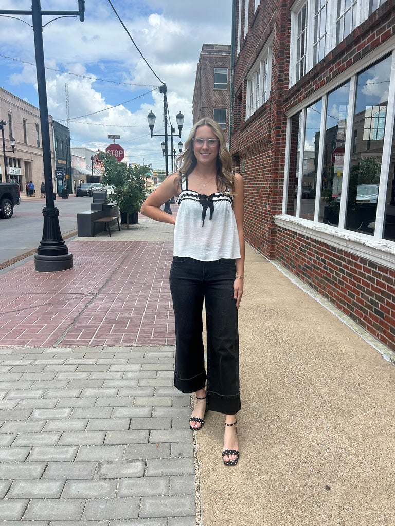 Style tip: Pair with wide leg denim (like shown!) or your favorite little black dress for an effortlessly polished look.