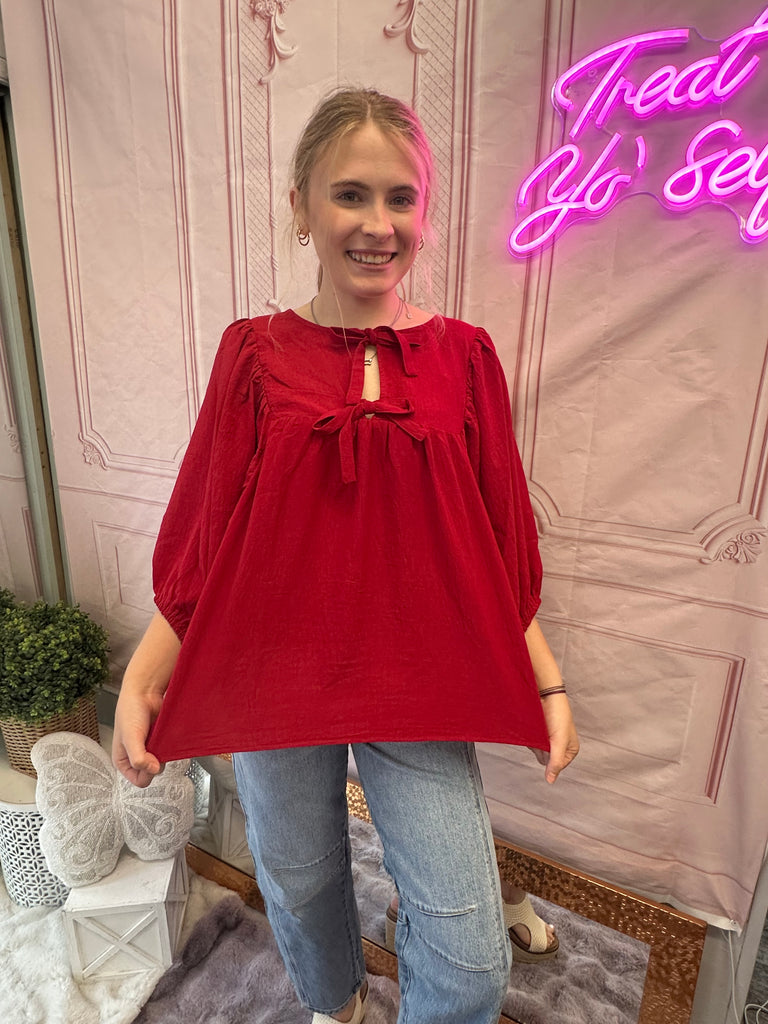 The Marlowe Blouse is your fall wardrobe’s warm hug. With its earthy rust hue, flowy silhouette, and soft keyhole tie detail, it’s a staple for pumpkin patch days, coffee dates, or just watching the leaves change. Pair with denim and boots, and you’re golden.