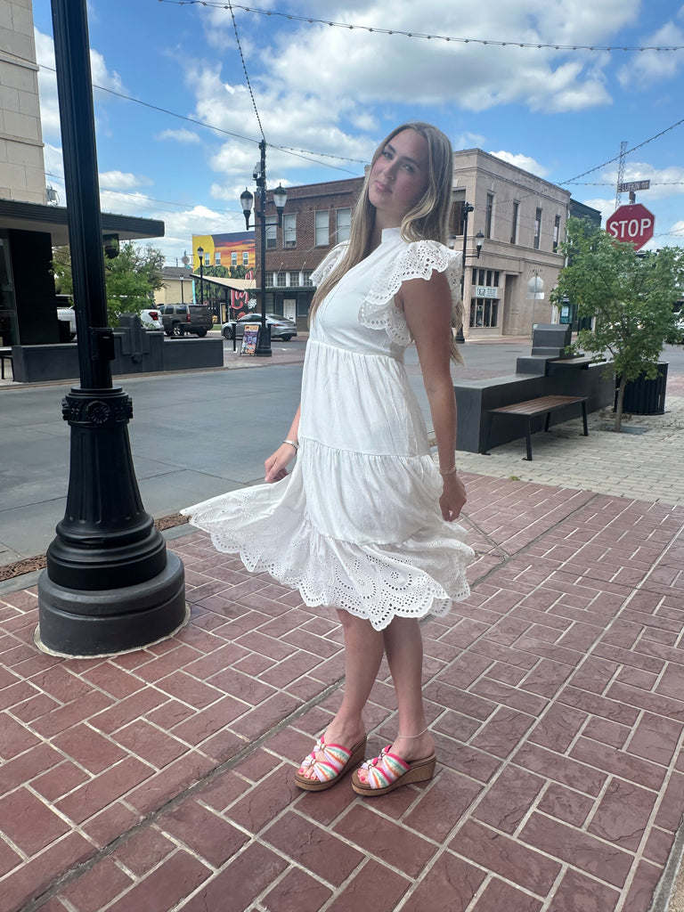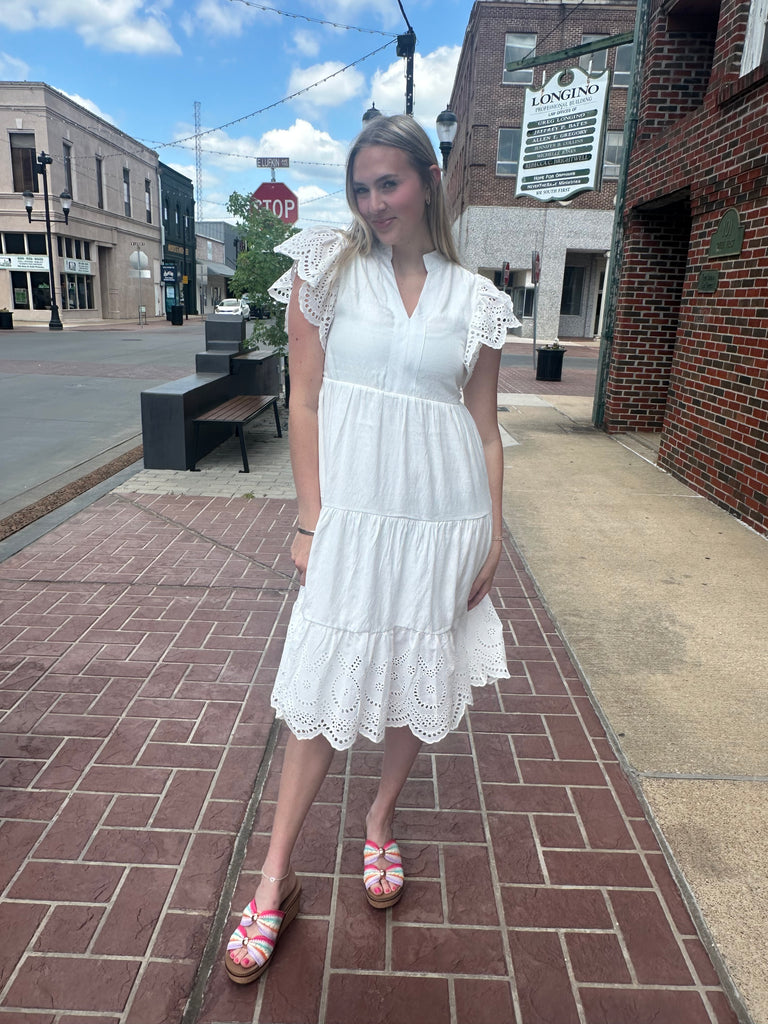 This classic white dress features delicate eyelet detailing and a soft, tiered silhouette that flatters without feeling restrictive. The lightweight fabric and breezy fit make it perfect for warm-weather occasions, while the elevated details keep it feeling special.