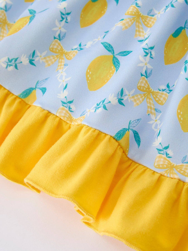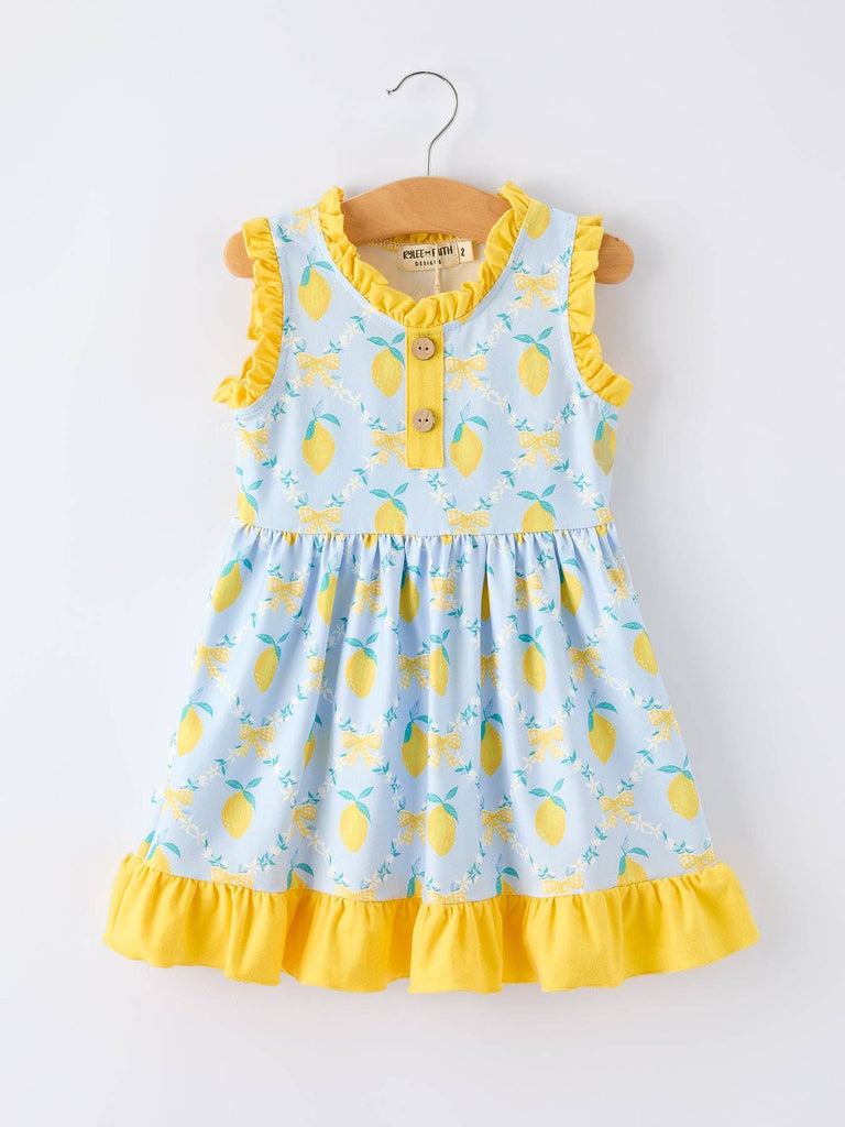Brighten her wardrobe with this charming sleeveless ruffle dress, featuring a cheerful lemon floral print perfect for warm weather adventures. The soft, breathable fabric keeps her comfortable during play, while delicate ruffles add a touch of whimsy and movement. Ideal for casual outings, family gatherings, or sunny days at the park, this dress combines style with practicality. Easy to care for and designed to last through countless wears, it's a versatile staple that pairs beautifully with sandals or sneakers. Give your little one a dress that's as fun and vibrant as she is.