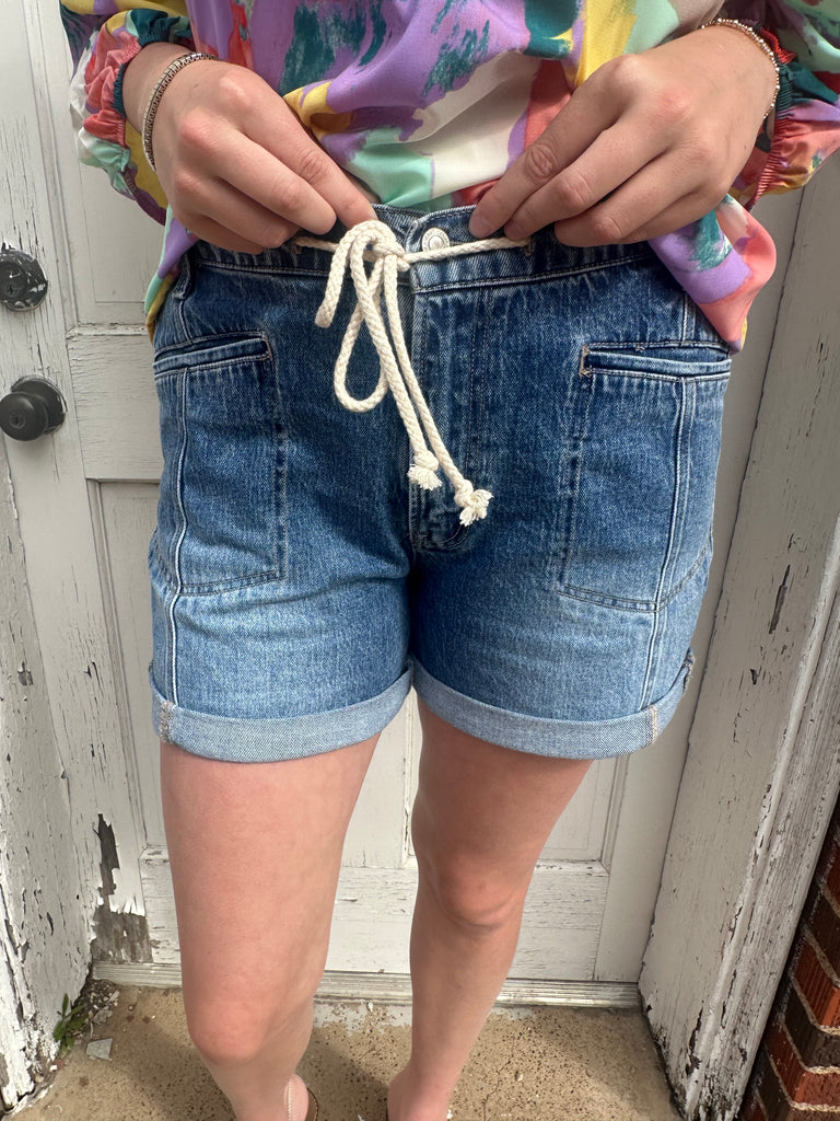These denim shorts feature a high-rise design with a comfortable stretch. The waistband includes an elastic back and a drawstring for an adjustable fit. They showcase welt pockets and a double cuff hem, all in a medium light wash. The rise measures 11 inches, the inseam is 4 inches, and the leg opening is 24.5 inches. The cuff dimensions are 1.25 inches by 2 inches. The model, standing at 5'10", is wearing a size small.