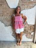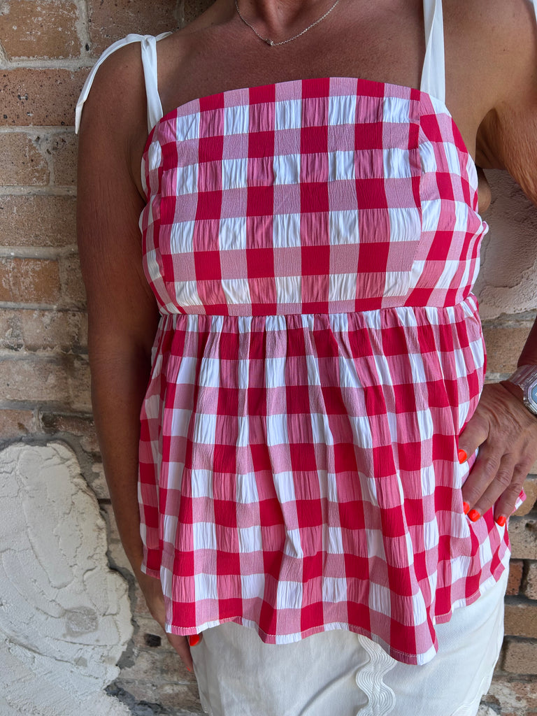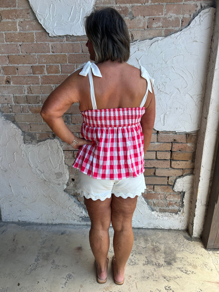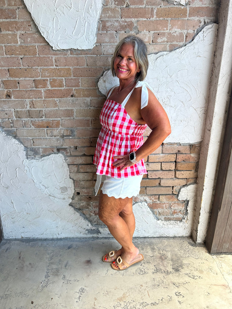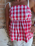 Get ready to add some sweetness to your wardrobe with our Sweet As Apple Pie Top! This cute plaid summer top is not only patriotic, but also features adjustable tie straps and a flattering babydoll style with a smocked back. Perfect for any summer occasion!